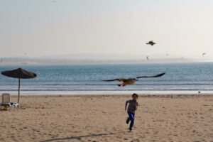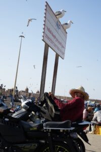 Ich machte mich also schnell auf den Weg nach Essaouira, einer, wie ich gehört hatte, kleinen Fischerstadt mit Hippie-Vibes. Nachdem ich dort abends angekommen war, verließ ich nur noch kurz mein Hostel, um mir etwas zu essen zu suchen. Dabei wurde ich dann aber direkt von ein paar Leuten angequatscht, die in einem Schmuckladen hingen. Letztendlich verbrachten wir die nächsten Stunden zusammen und ich ließ mich zum besten Imbiss, der gemütlichsten Kneipe und an den Strand mitschleppen.