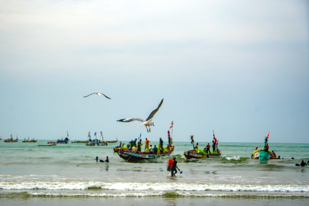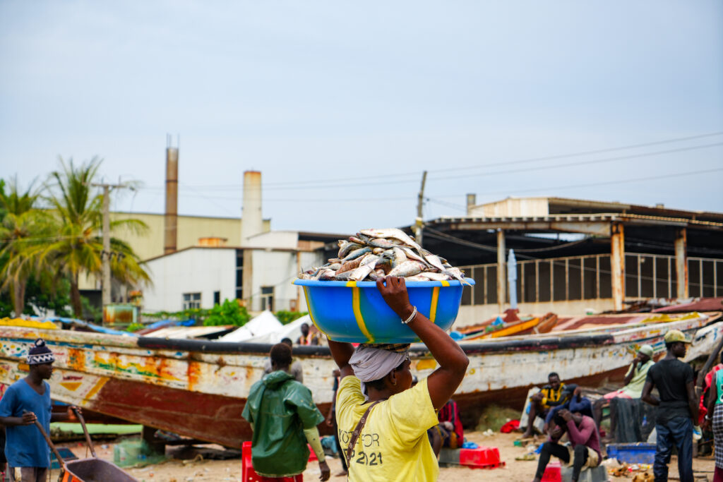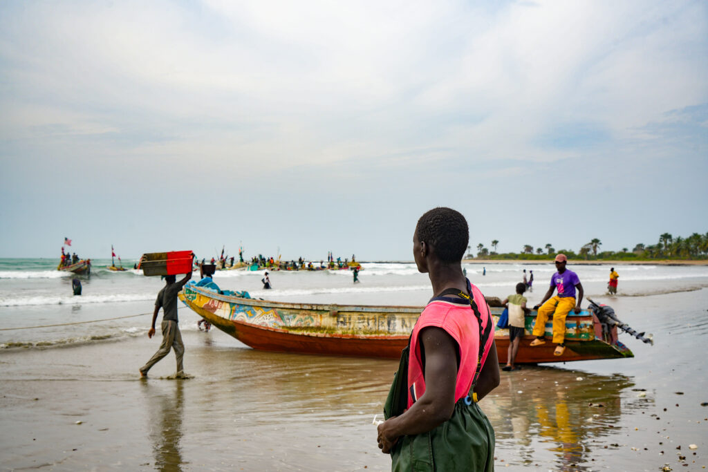 Der Zeitung nd hatte ich vorgeschlagen, einen Artikel über die Herausforderungen der Fischer in der Region zu schreiben. Hier in Sanyang und jeweils in den beiden nächstgelegenen Ortschaften befanden sich Fischmehlfabriken, die große Mengen Fisch zu Fischmehl und -öl vor allem zur Tierfutter-Herstellung verarbeiten. Zudem machten industrieller Fischfang und zunehmende Überfischung den lokalen Fischern das Leben schwer. Das alles erzählten mir Bewohner:innen des Städtchens Gunjur unweit von Sanyang in dem ich der Sache an einem Samstagnachmittag auf den Grund ging. Zuerst stand ich jedoch noch unschlüssig am Strand und beobachtete das Treiben vor mir. Ich war gerade erst von einem Mini-Van hier ausgespuckt worden und war mental noch nicht bereit, aktiv auf Leute zuzugehen. Also wartete ich erstmal ab.
